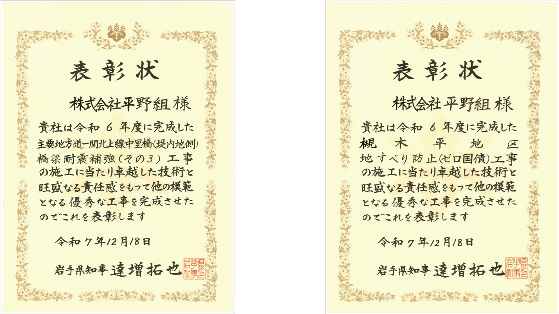 この表彰は、施工技術の向上と建設業の健全な発展を目的に、岩手県が工事を評価するものです。