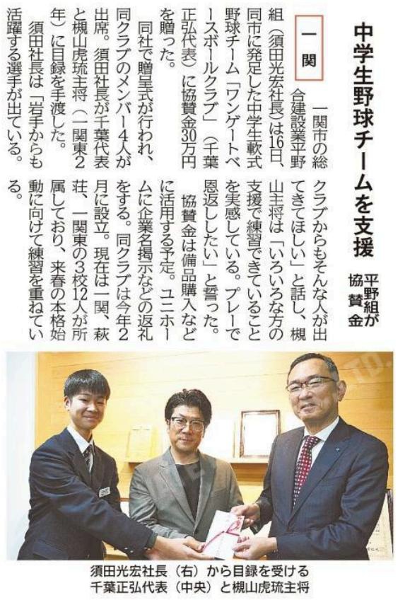 ONEGATE BBC(中学校軟式野球クラブ)への協賛を通じて、健全な育成と地域活性化に貢献してまいります。